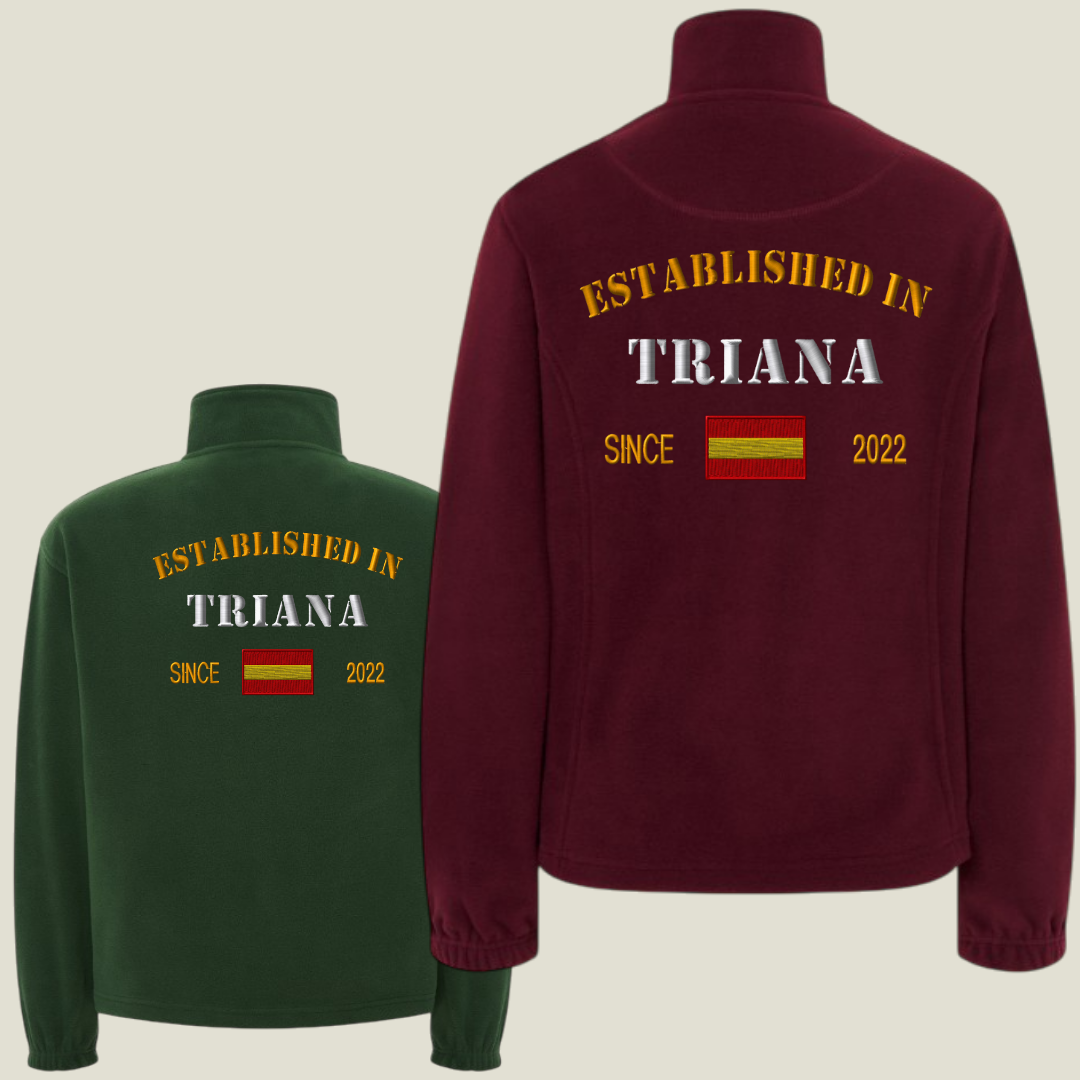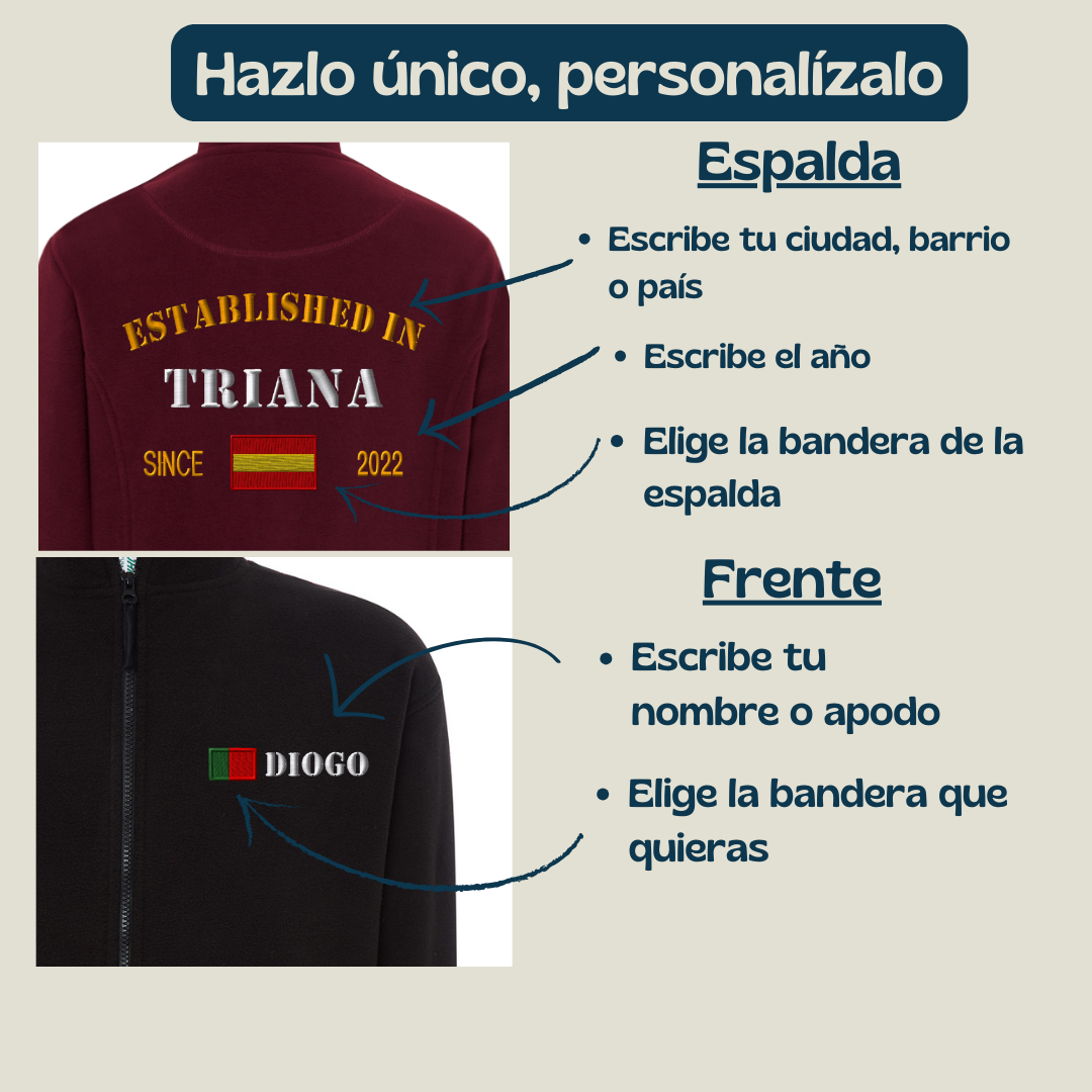 Haz que tu polar hable de ti. En la espalda, podrás lucir "Established in [Tu ciudad, barrio o país] [Año]" como un homenaje a tus raíces. En el frente, destaca tu nombre junto a la bandera de tu nacionalidad, creando una prenda que refleja quién eres y de dónde vienes.
